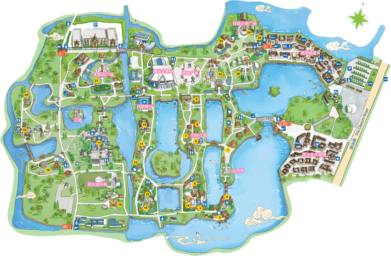 傣族人口約107萬人,主要分布在云南的德宏傣族景頗族自治州、西雙版納傣族自治州及瀾滄江流域的河谷壩子區(qū)域。傣族寨是進(jìn)入民族村的第一個村寨,占地面積27畝,三面環(huán)水,綠樹掩映。一幢幢“干欄式”傣家竹樓,通過蜿延的紅砂石小徑聯(lián)向肅穆的緬寺。巍峨壯觀的白塔,精巧玲瓏的風(fēng)雨橋,以及風(fēng)雨亭、水井、鐘亭等建筑充滿著傣家的濃郁風(fēng)情,是傣寨真實的民間景觀再現(xiàn)。一年一度的“潑水節(jié)”期間,這里都有活潑歡快的“象腳鼓舞...